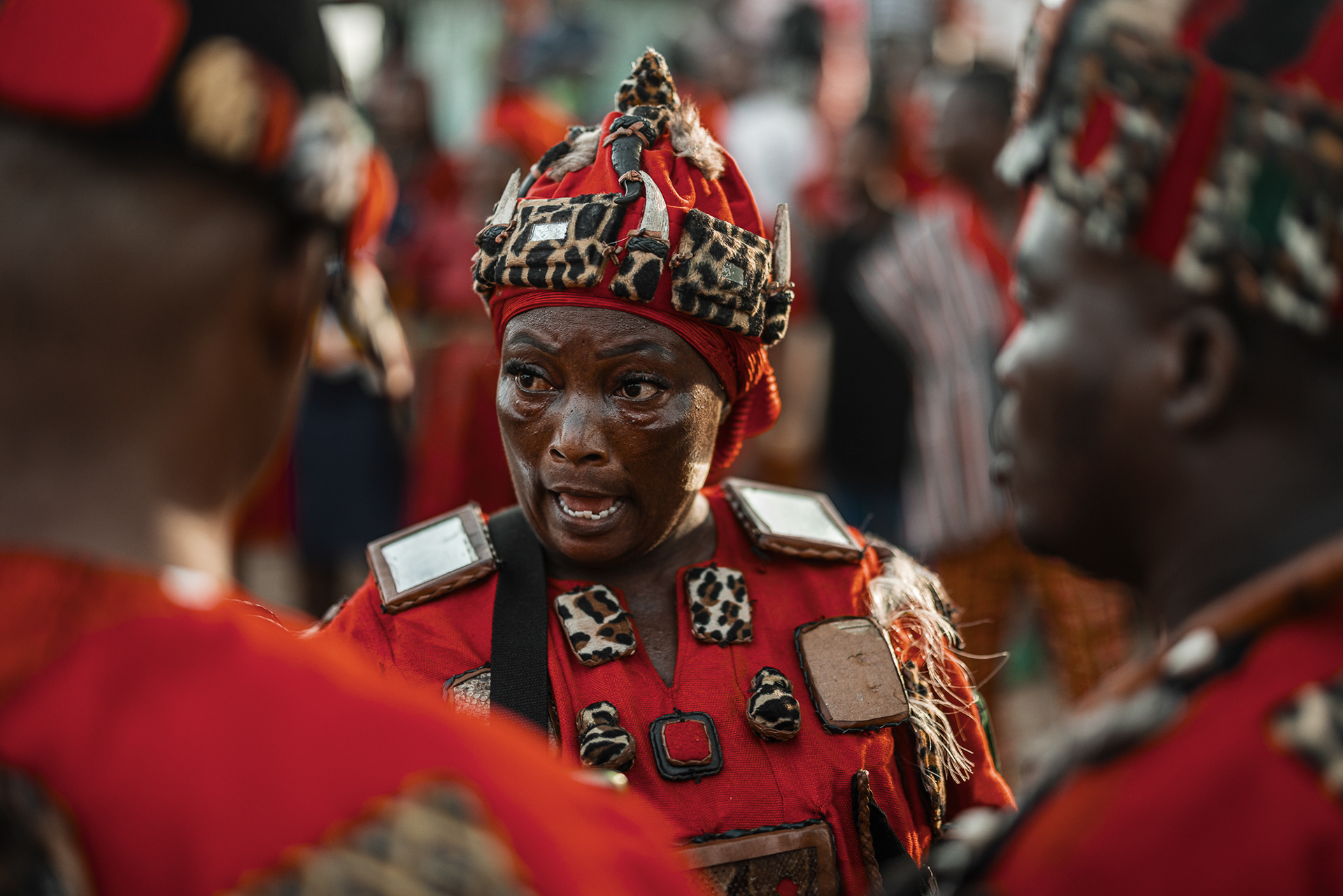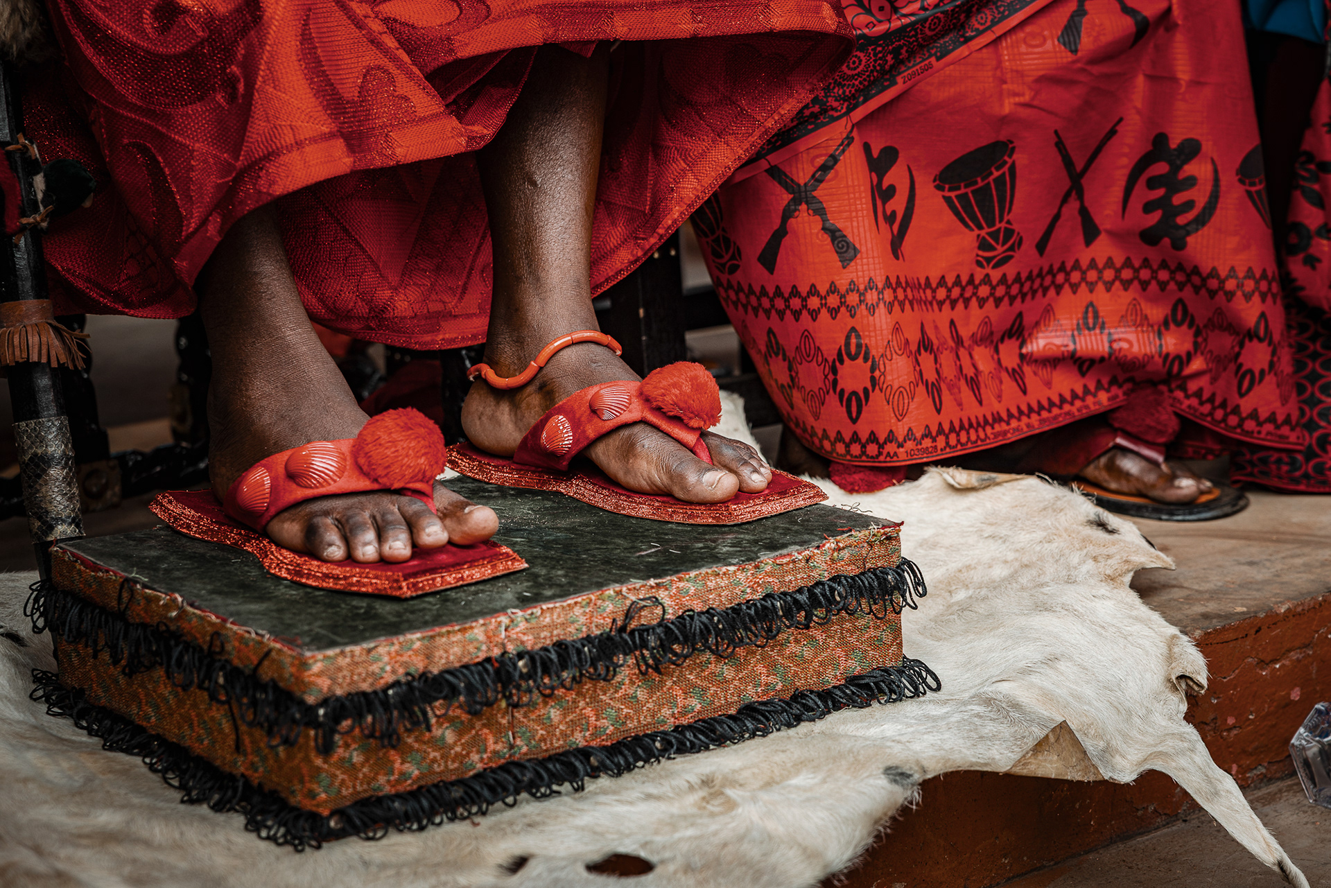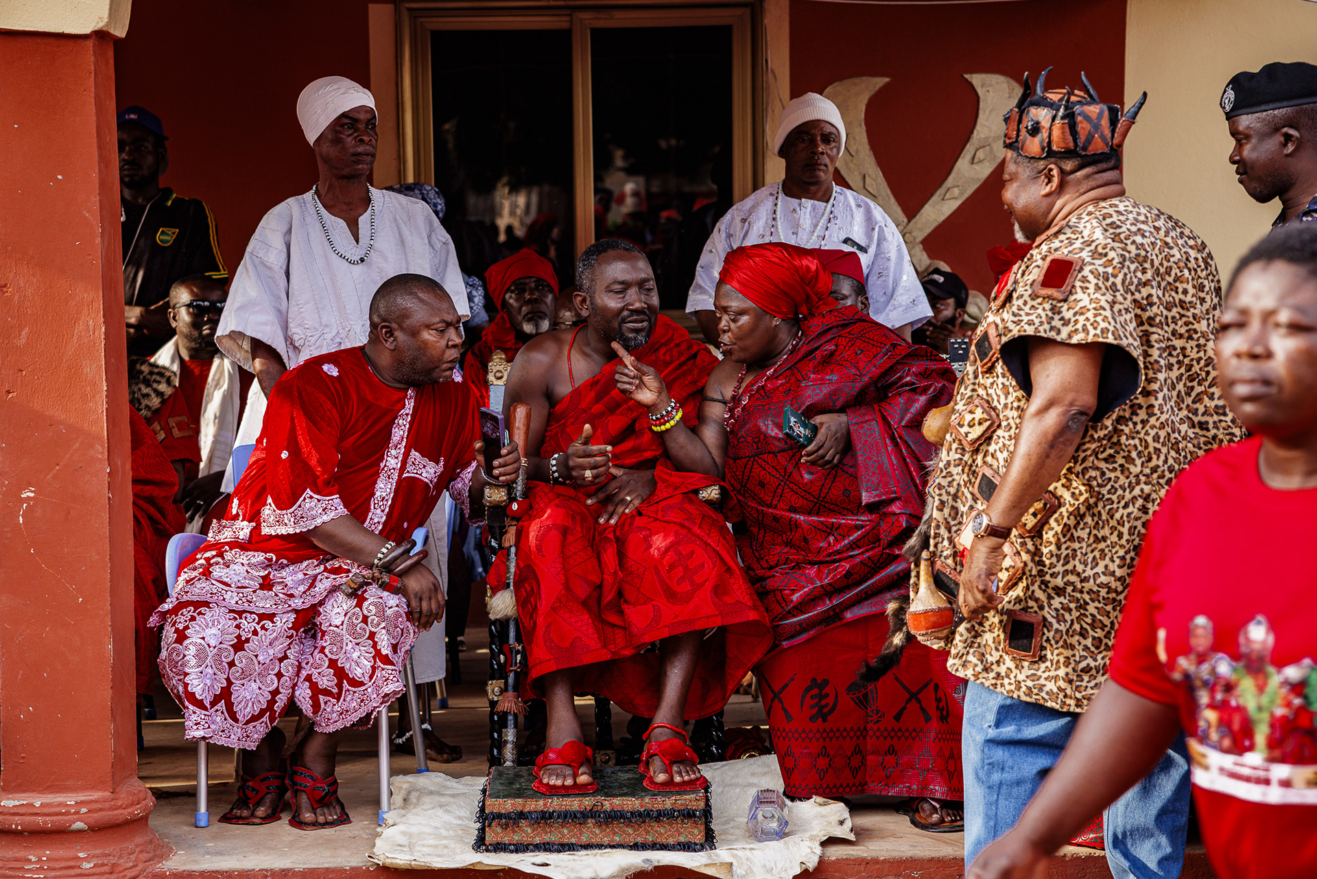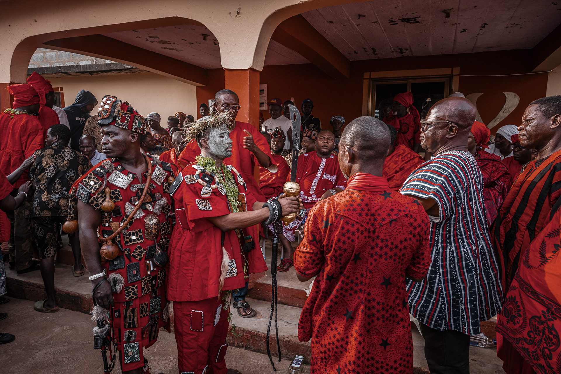 The four-day inauguration ritual begins with a symbolic hunt. Warriors dressed entirely in red — a colour associated with war and protection — search for the chosen leaders. Firearms are carried as ceremonial symbols of readiness to defend the community. Once found, the future leaders are taken to a sealed, secret space where they are fed and instructed by senior chiefs on their responsibilities and obligations.