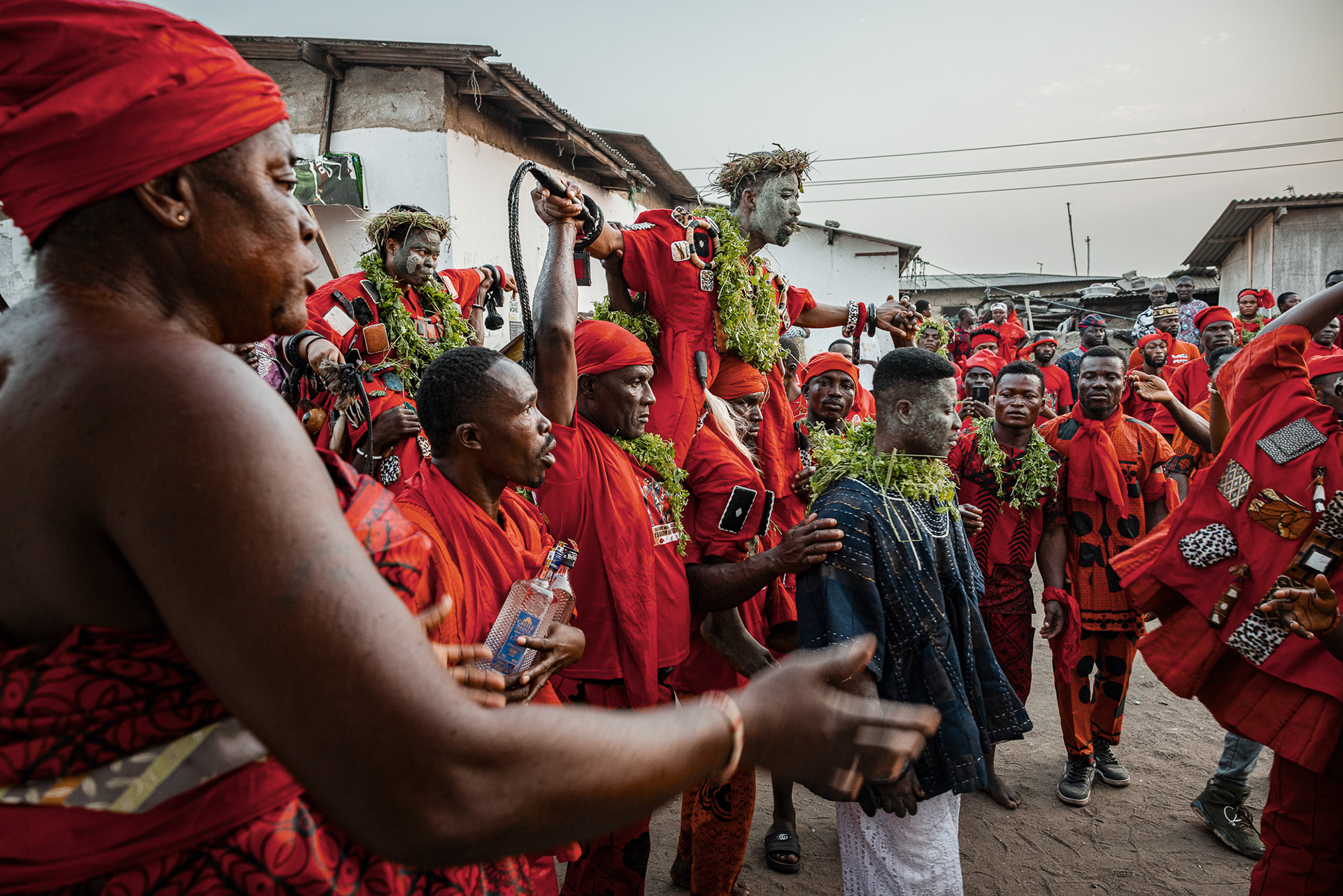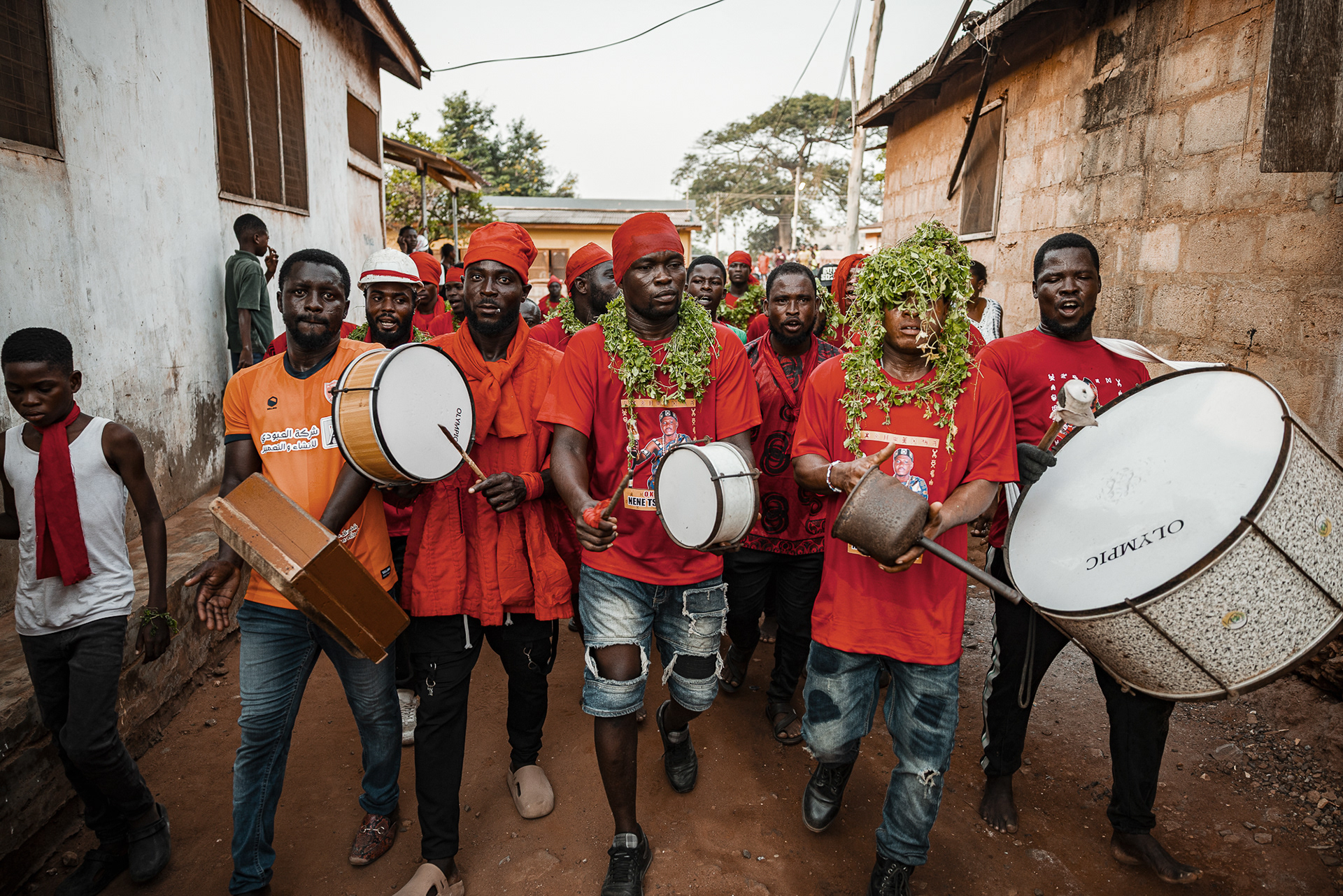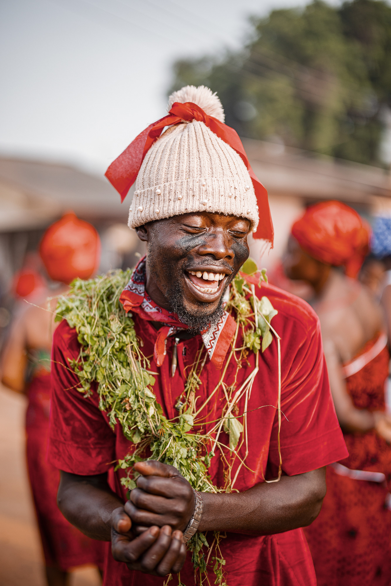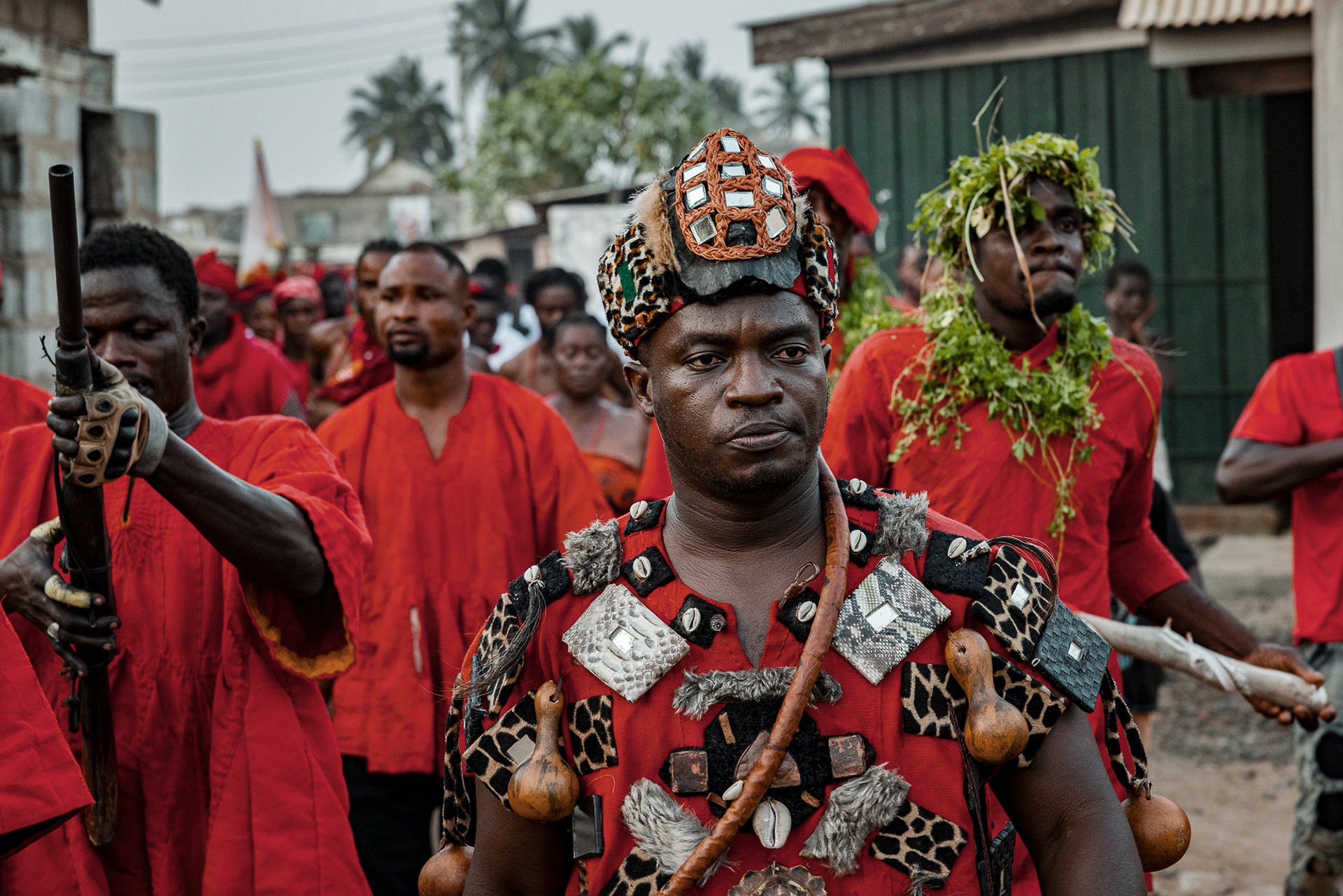 On the final day, a procession moves through the community. Priests and priestesses lead the march with closed eyes in trance. The chief and queen mother are carried on the shoulders of community members, holding herbs in their mouths for protection and ritual silence. The procession visits royal family homes to seek acceptance, collaboration, and blessings.