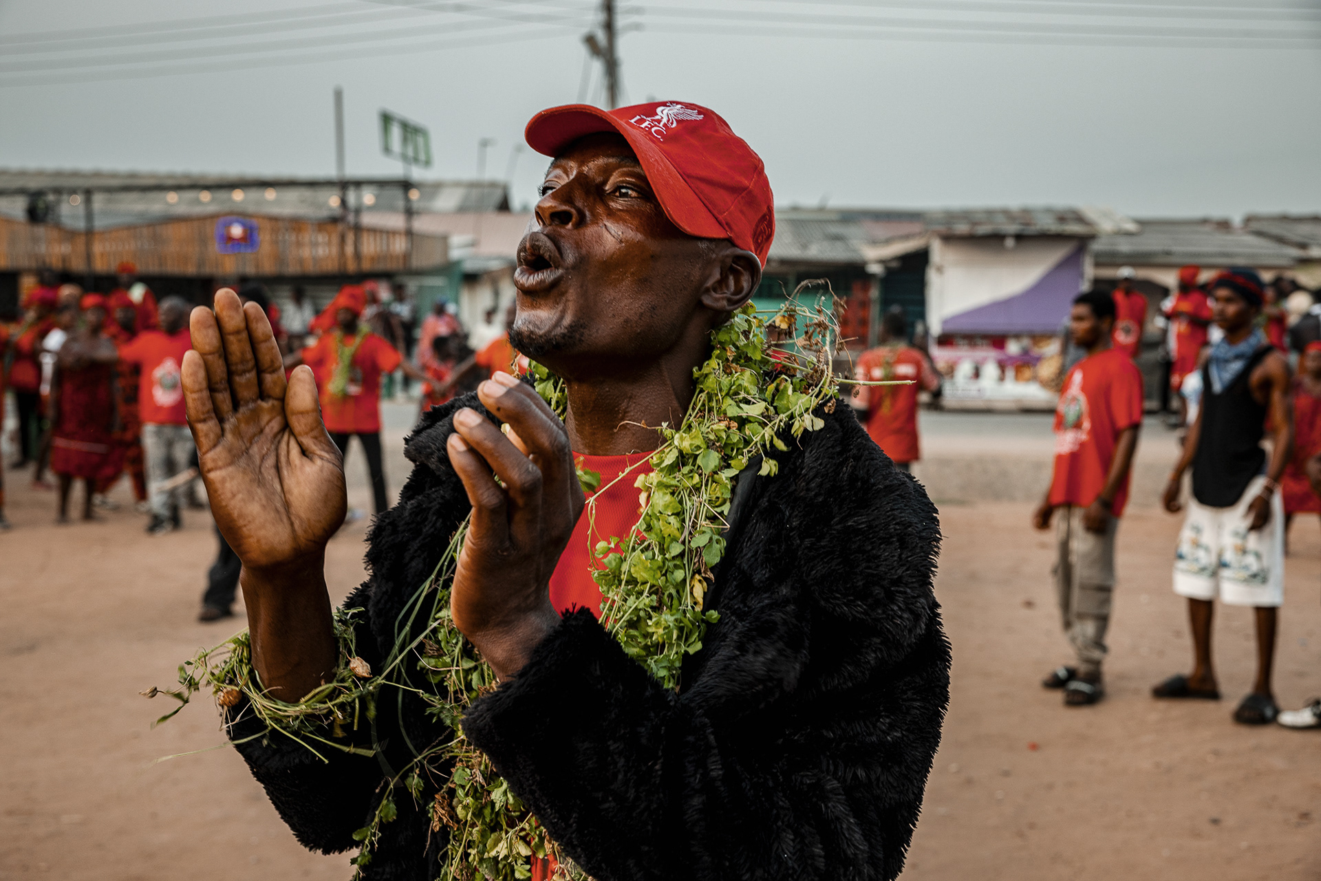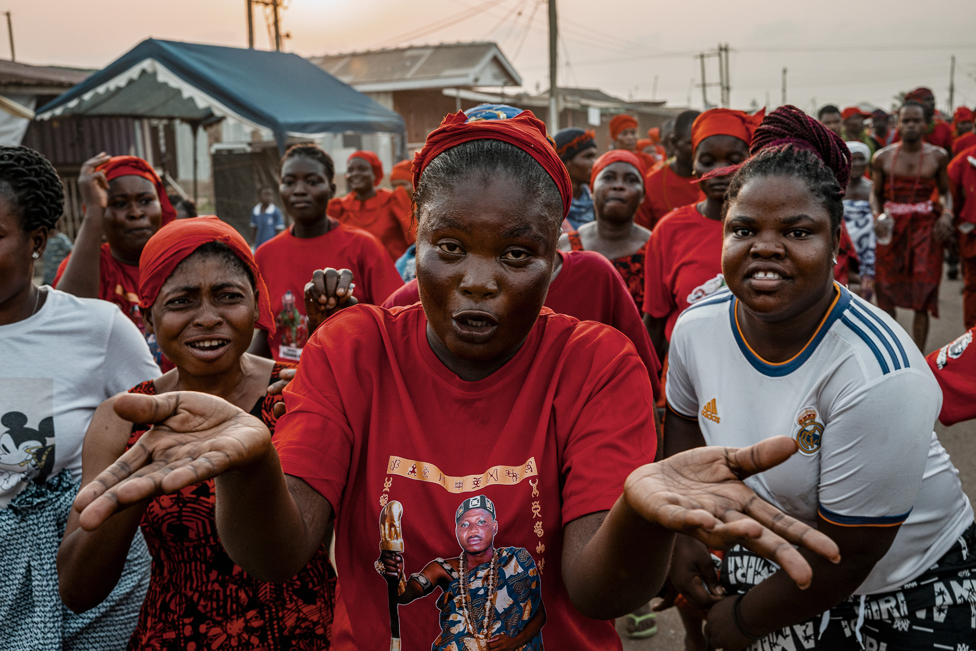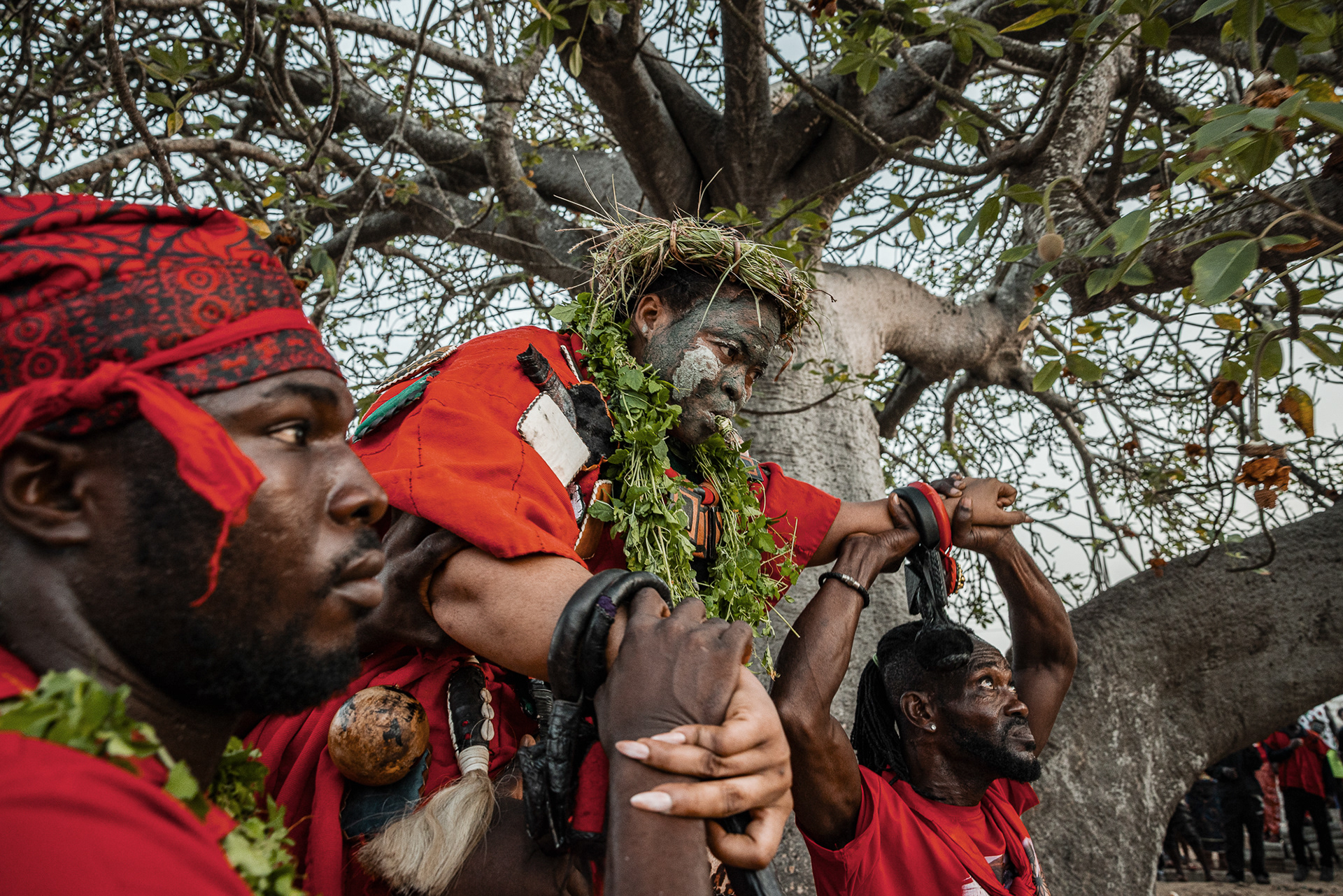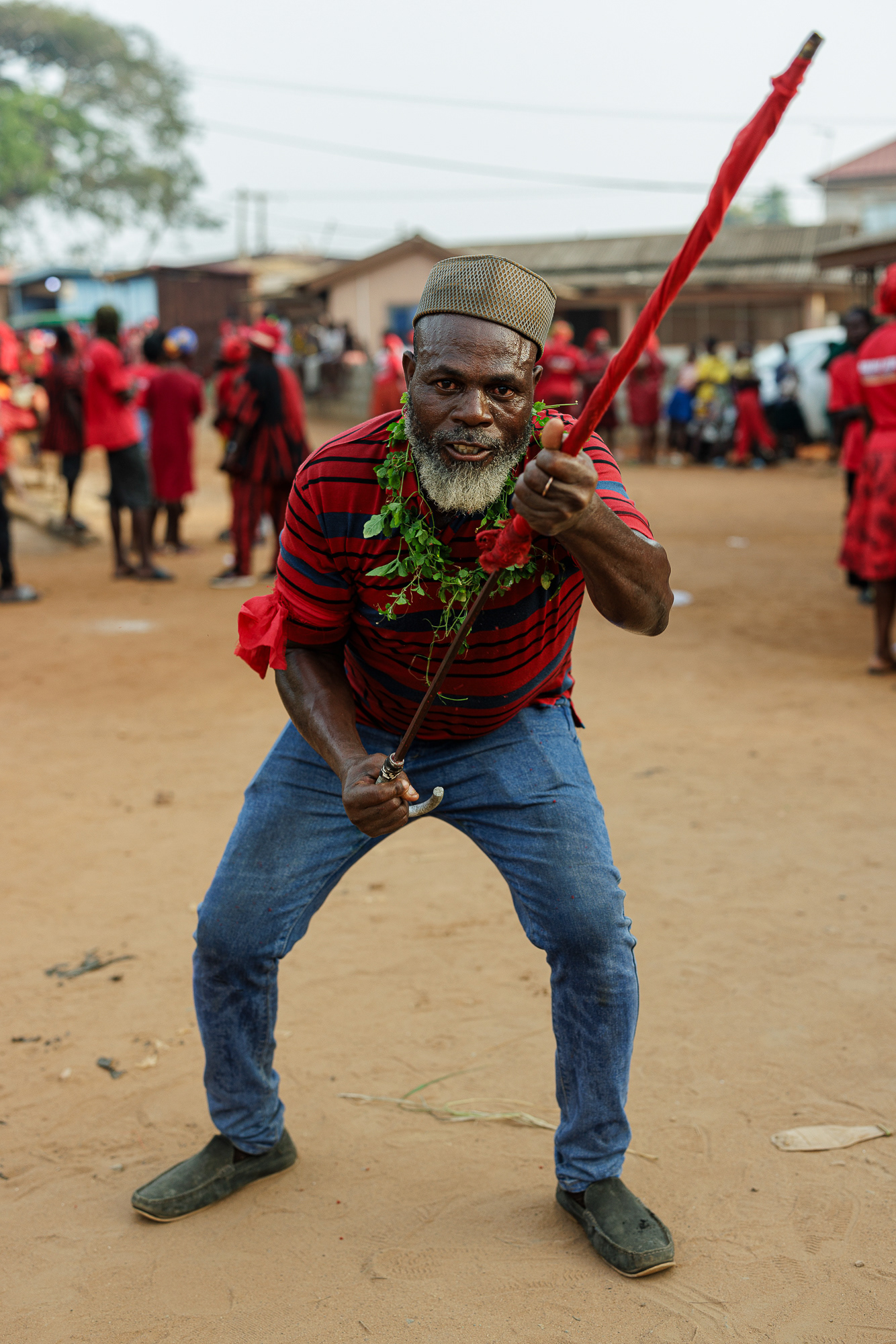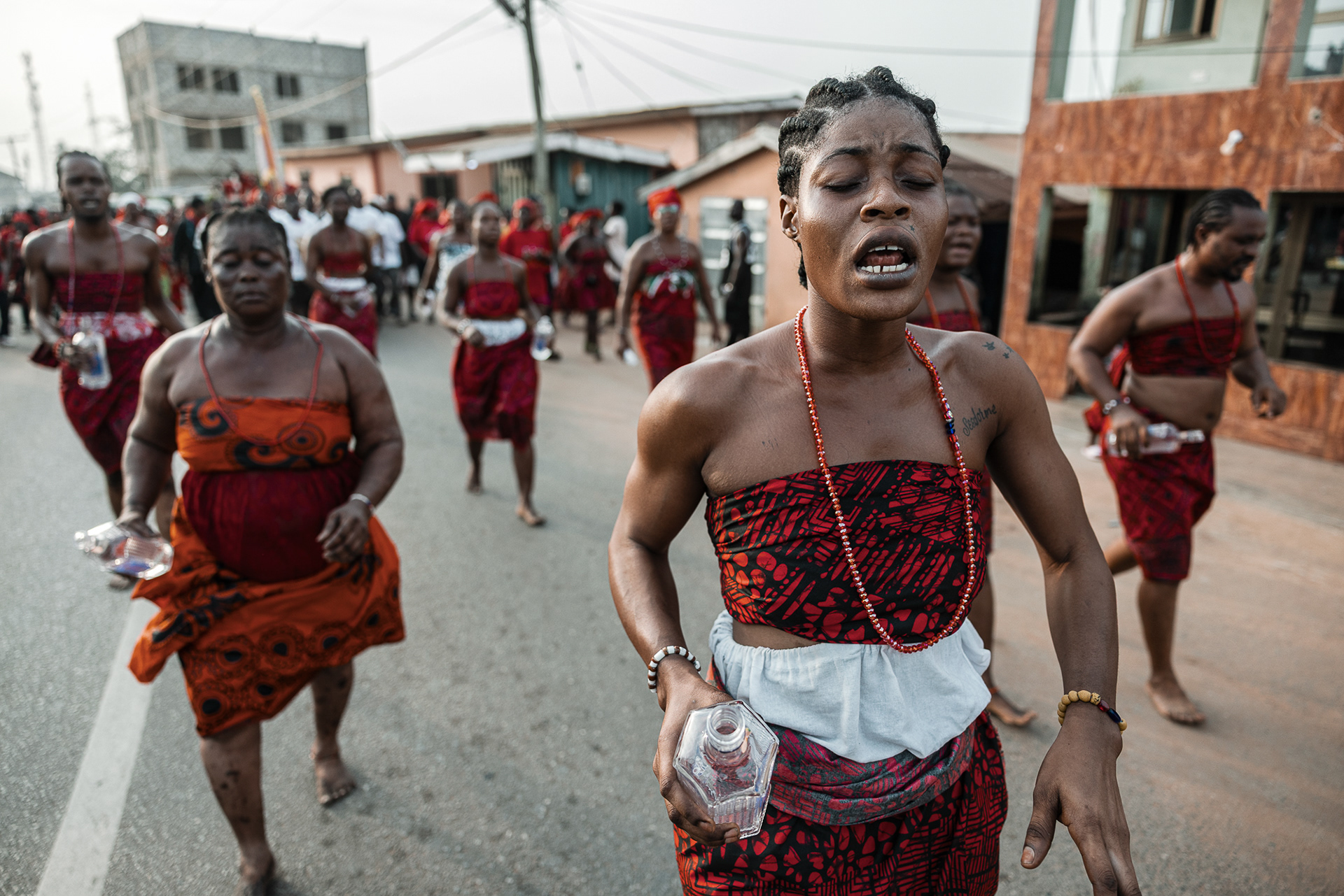 On the final day, a procession moves through the community. Priests and priestesses lead the march with closed eyes in trance. The chief and queen mother are carried on the shoulders of community members, holding herbs in their mouths for protection and ritual silence. The procession visits royal family homes to seek acceptance, collaboration, and blessings.