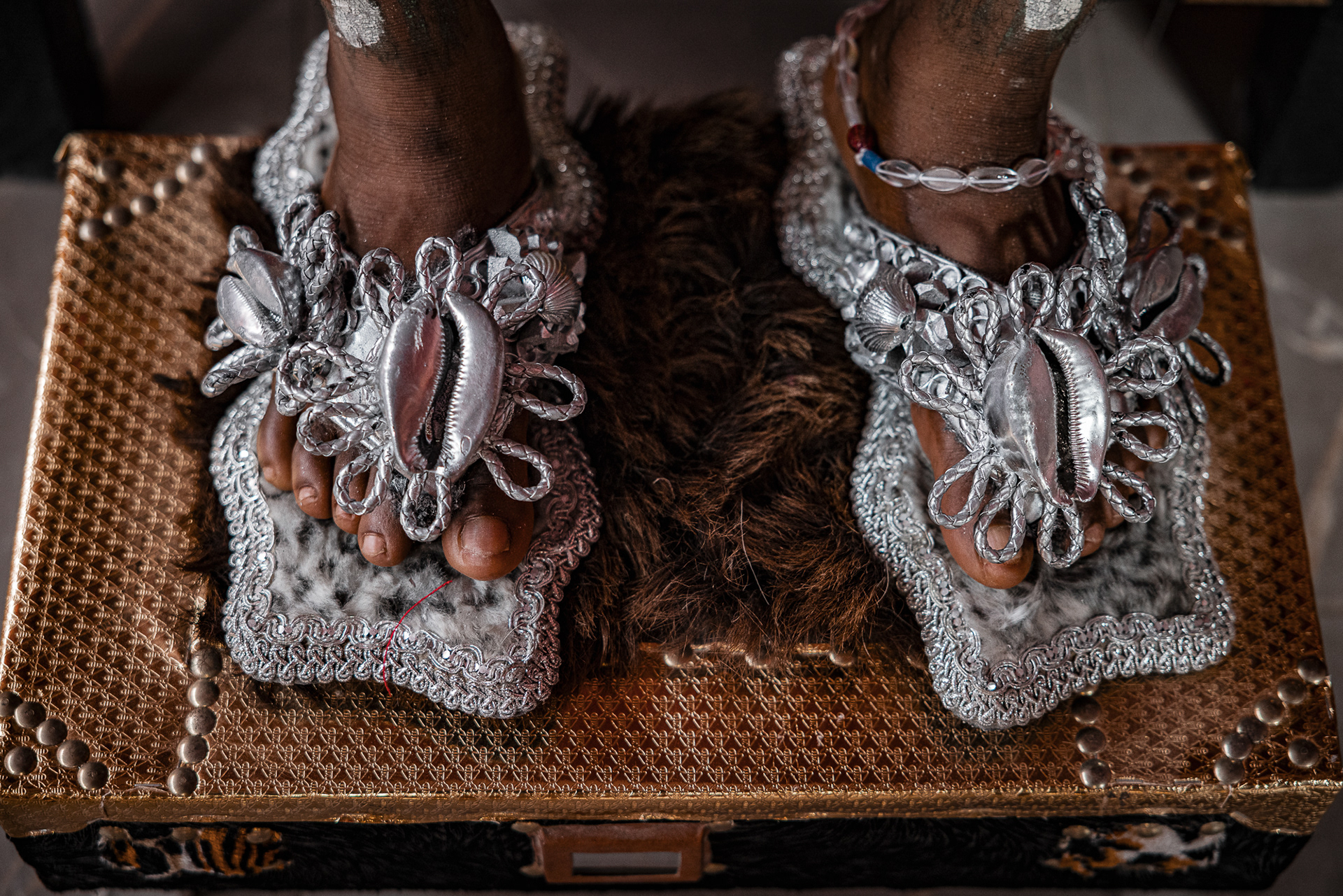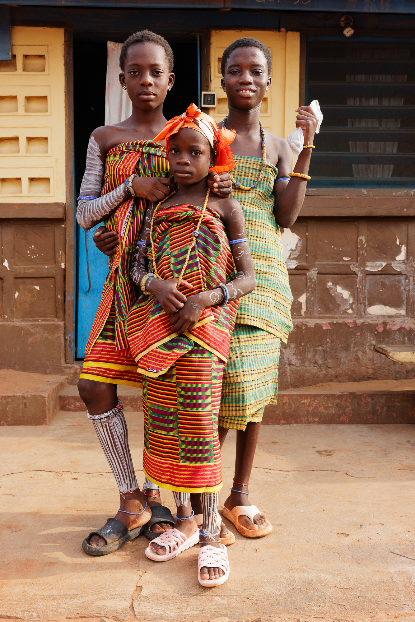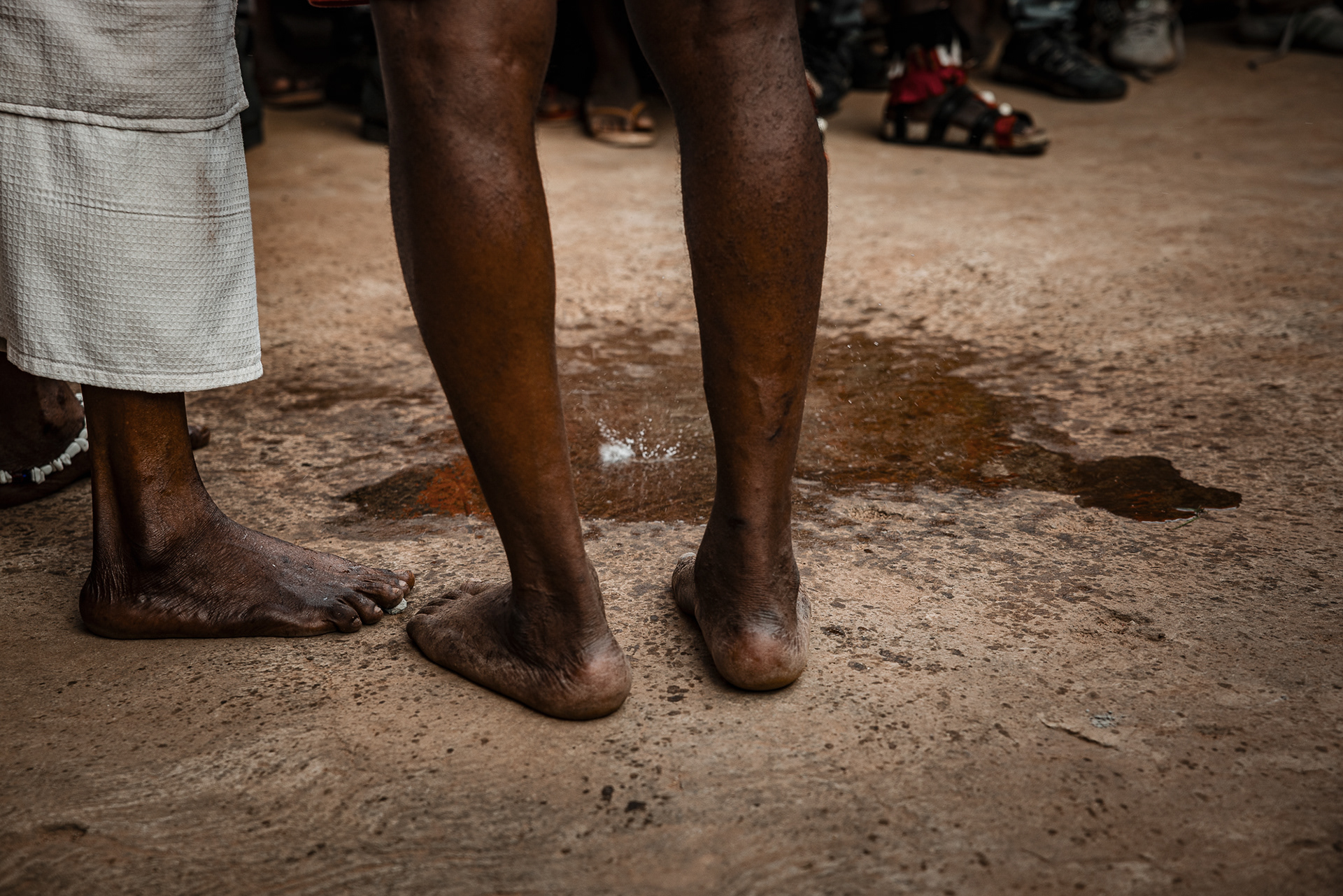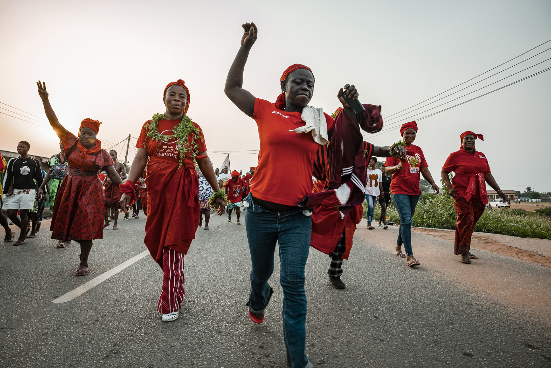 On the final day, a procession moves through the community. Priests and priestesses lead the march with closed eyes in trance. The chief and queen mother are carried on the shoulders of community members, holding herbs in their mouths for protection and ritual silence. The procession visits royal family homes to seek acceptance, collaboration, and blessings.