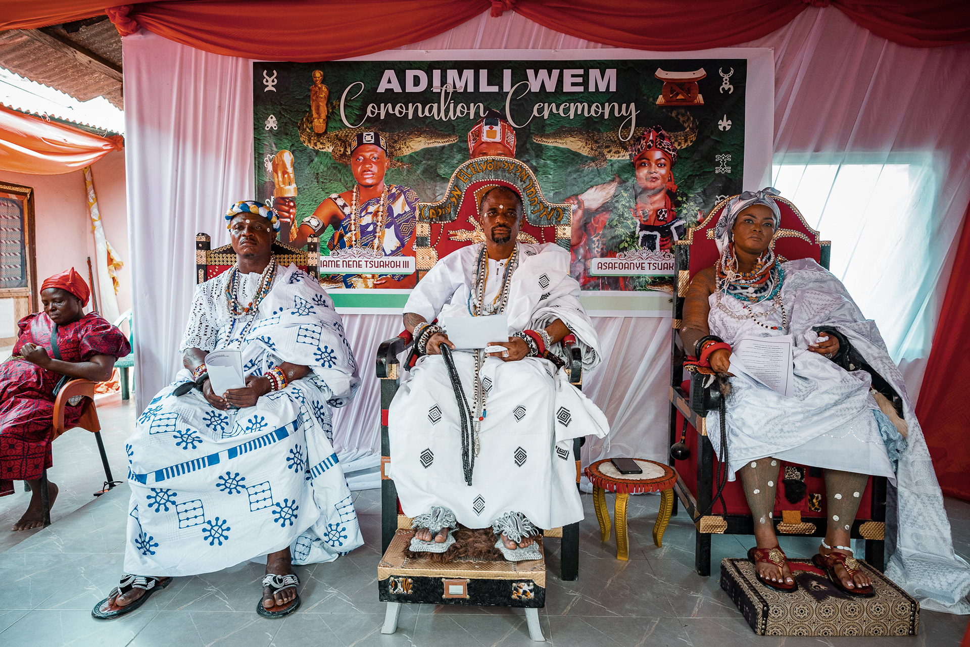 The coronation concludes before regional chiefs, queen mothers, elders, the paramount chief, and is led by a master of ceremony and a linguist, formally installing the new leaders.